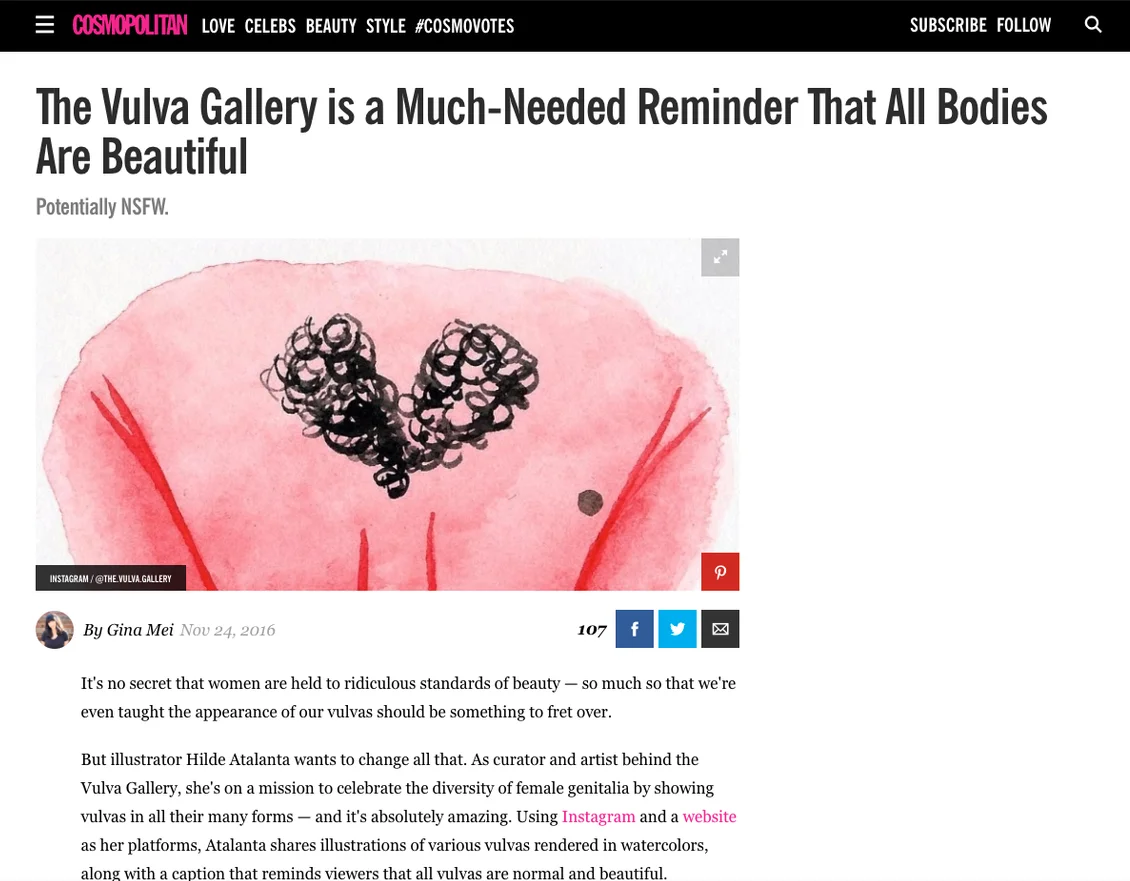 The past week has been incredible - after The Huffington Post published an article about The Vulva Gallery one week ago, my Instagram account has grew very quickly (more than 10.000 new followers), and there have been many publications about The Vulva Gallery. In the past days, also Argentina, The Netherlands and Scandinavia discovered The Vulva Gallery: BigBang from Argentina, Cosmopolitan NL, Menaiset from Finland and Solo from Sweden all published features about The Vulva Gallery on their websites.